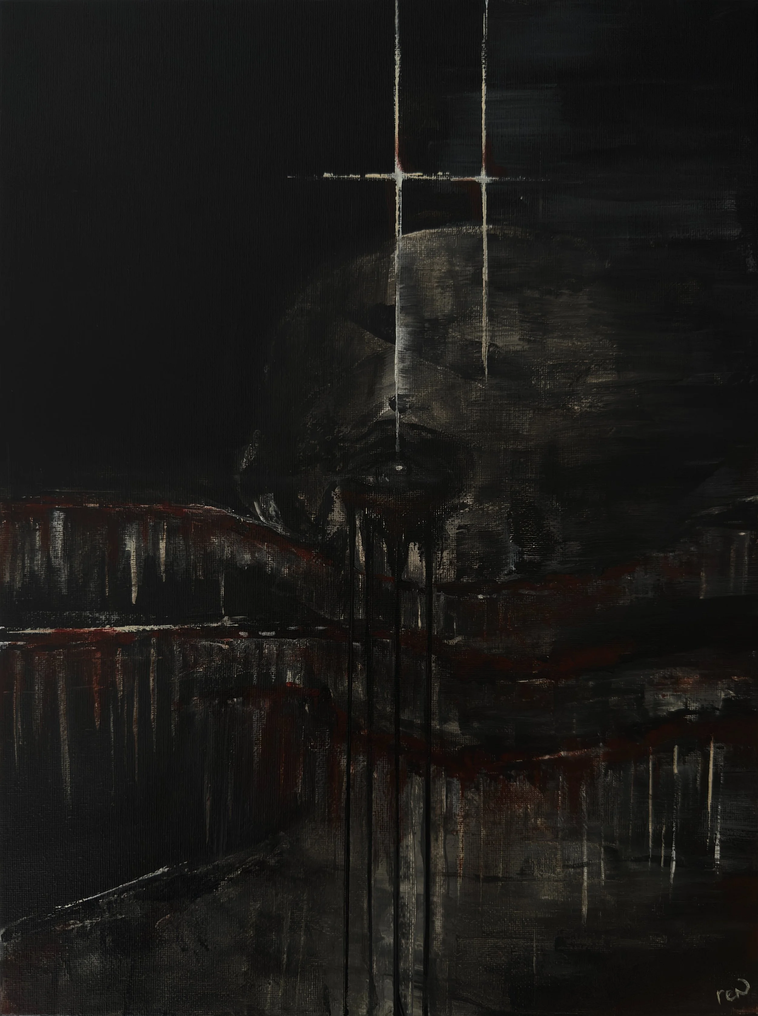 Abstract dark painting featuring a face with horns, large eyes, and dripping paint, with swirling lines and geometric shapes surrounding it.